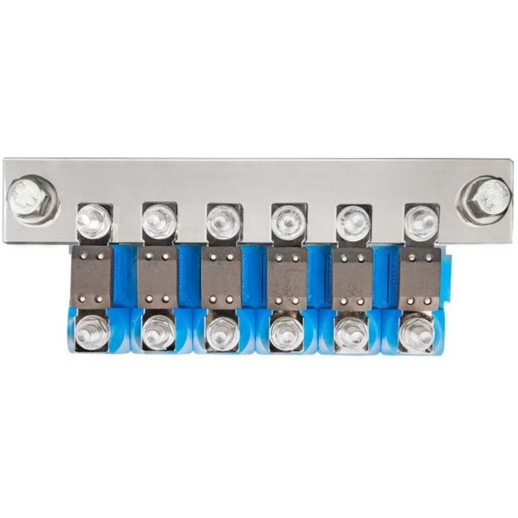 La barra para conectar 6 portafusibles modulares Mega-fuse de Victron Energy está pensada para crear una distribución común de alta corriente en sistemas que agrupan varios portafusibles MEGA. Fabricada en cobre de 40 x 5 mm, esta barra permite unir seis posiciones en un solo conjunto y facilita una instalación más ordenada, robusta y preparada para aplicaciones de alta potencia.