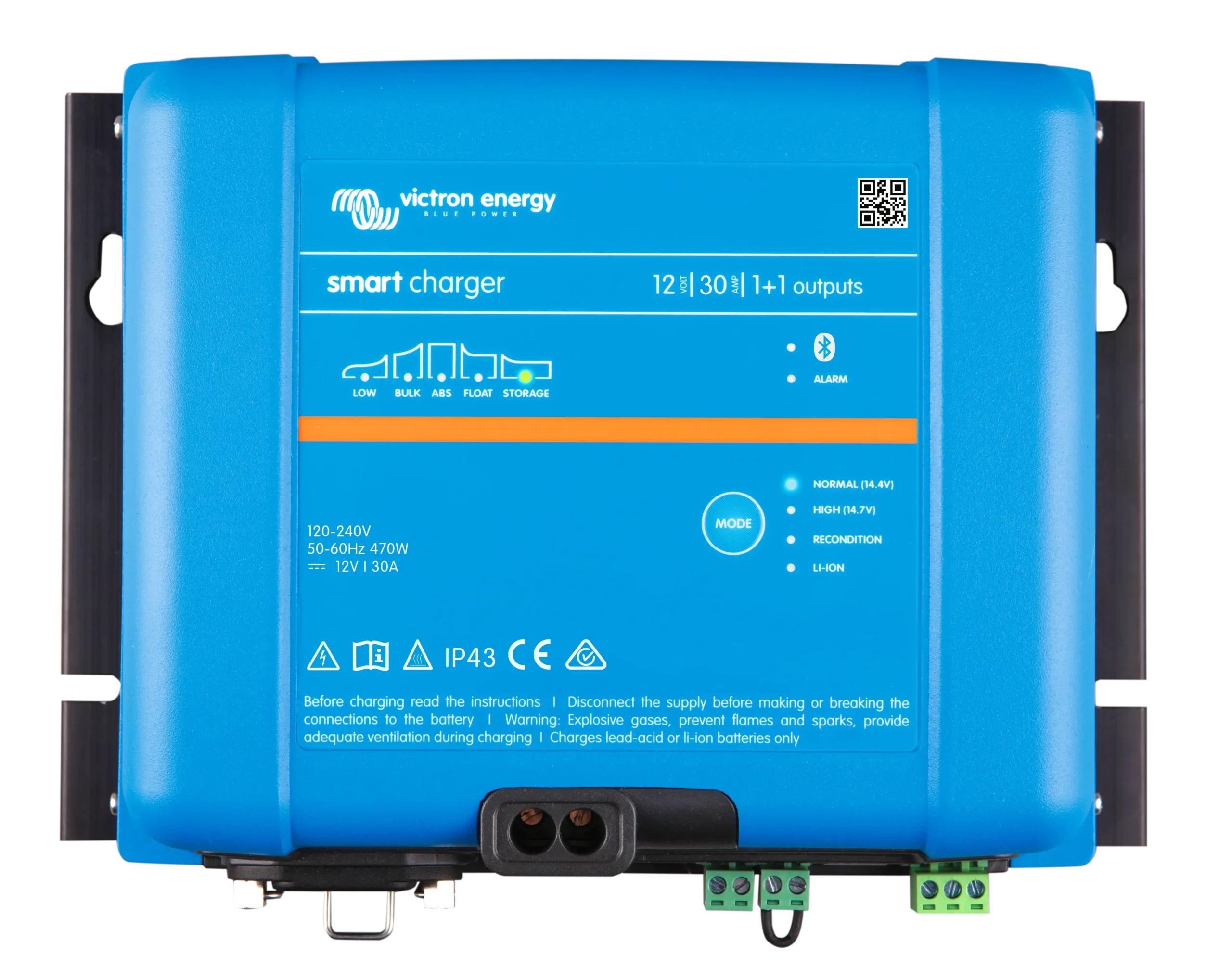 El Victron Phoenix Smart IP43 12/30 (1+1) 120-240 V es un cargador de baterías inteligente de 12V con 30 A de carga, Bluetooth integrado, comunicación VE.Direct y dos salidas: una principal y otra auxiliar para batería de arranque. Es una solución fiable y eficiente para sistemas náuticos, camper, industriales y de servicio con monitorización avanzada y carga adaptativa.