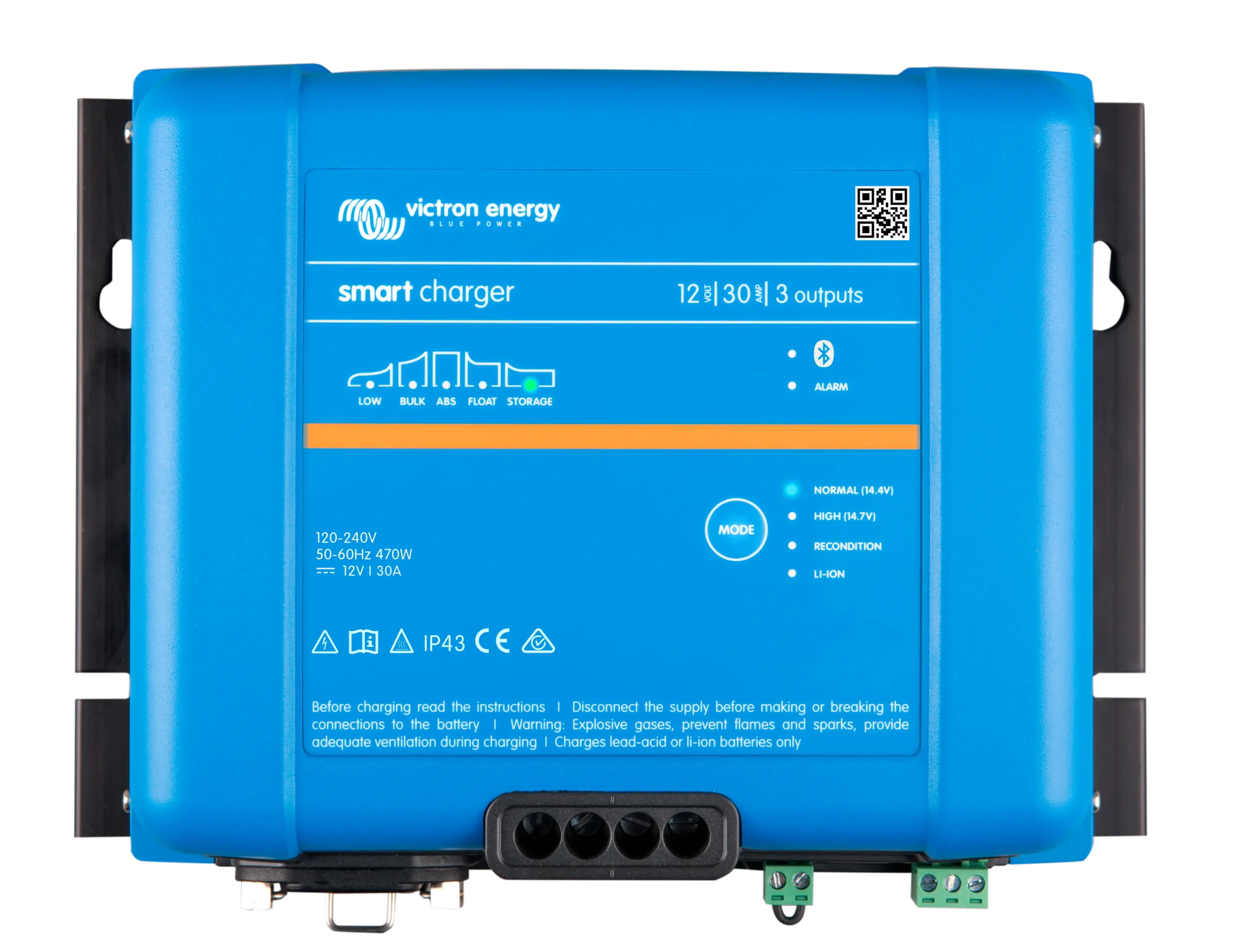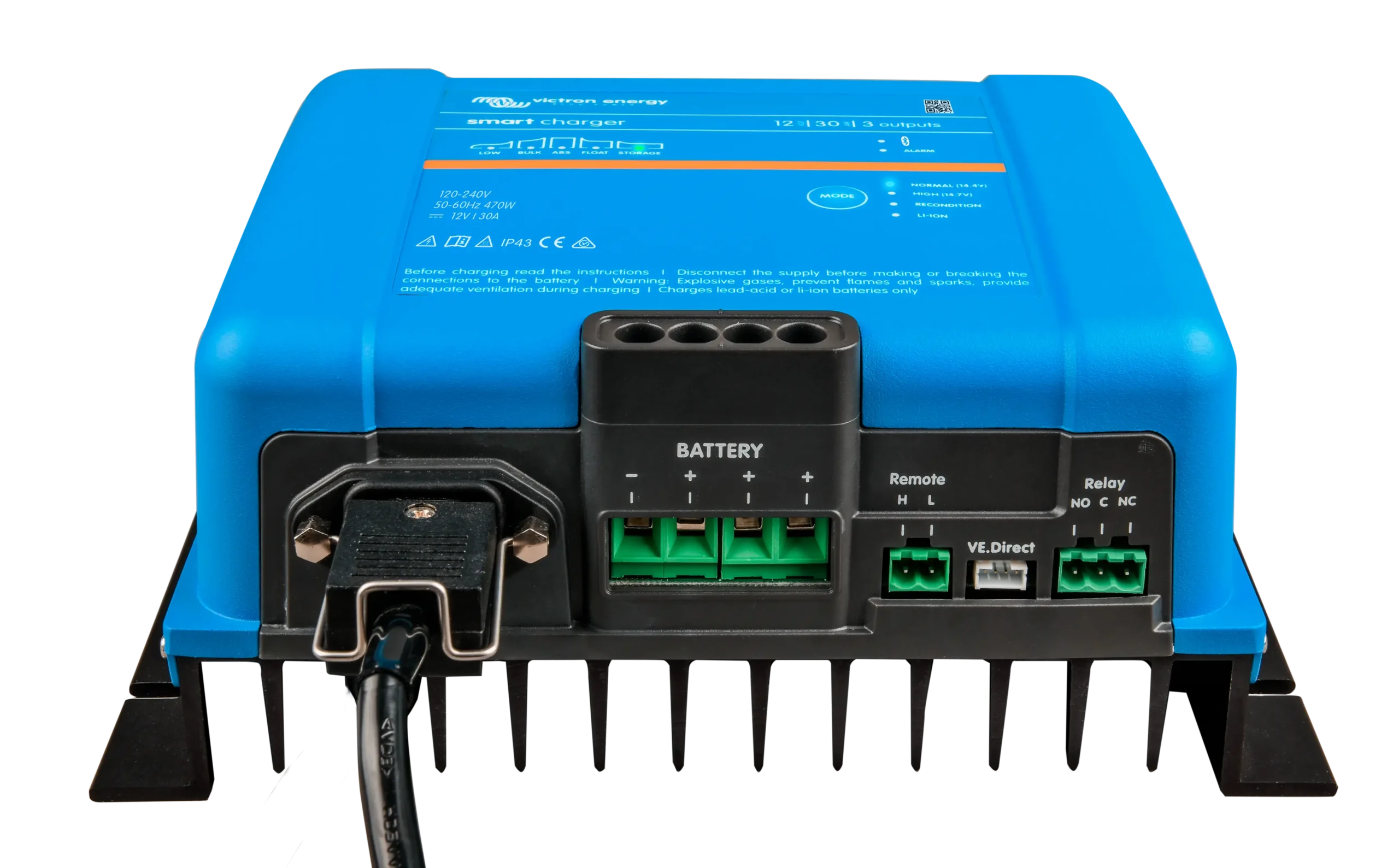 El Victron Phoenix Smart IP43 12/30 (3) 120-240 V es un cargador inteligente de 12V y 30 A con tres salidas, Bluetooth integrado y comunicación VE.Direct. Está pensado para cargar hasta tres bancadas de baterías con gestión avanzada, alta eficiencia y control inalámbrico.