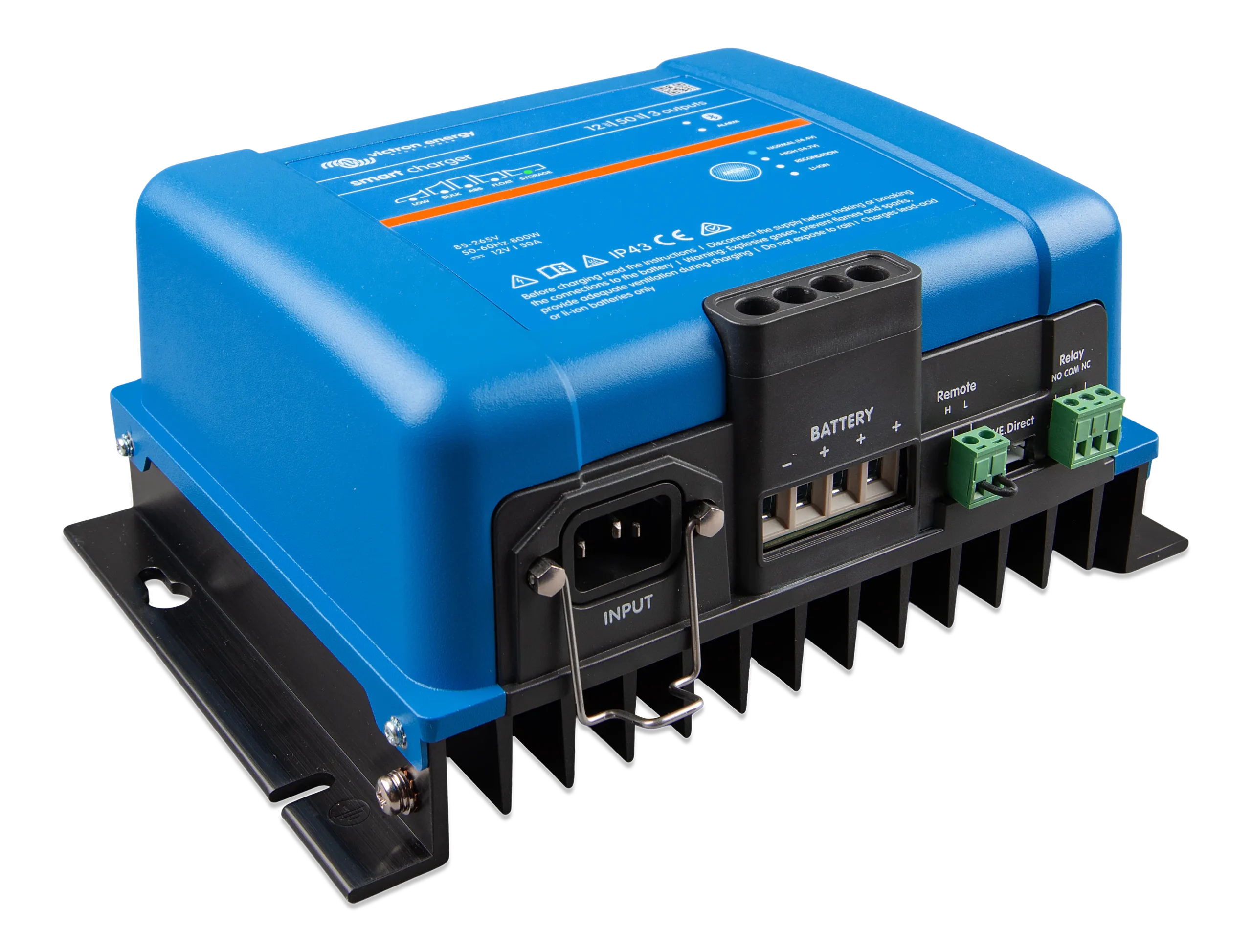 Una de las grandes ventajas del Victron Phoenix Smart IP43 12/50(3) 120/240 V es su configuración de tres salidas. Cada salida puede suministrar la corriente nominal completa, aunque la suma total no supera la capacidad del cargador, lo que permite una gestión muy flexible de varias bancadas dentro de una misma instalación. Además, este modelo también puede cargar baterías de ion litio LiFePO4 y puede trabajar con control de encendido y apagado mediante BMS, así como con control completo de tensión y corriente por Bluetooth. Esta versatilidad lo hace especialmente interesante para instalaciones modernas donde se combinan distintos tipos de acumulación y donde se valora poder configurar con precisión el comportamiento del cargador según las necesidades reales del sistema.