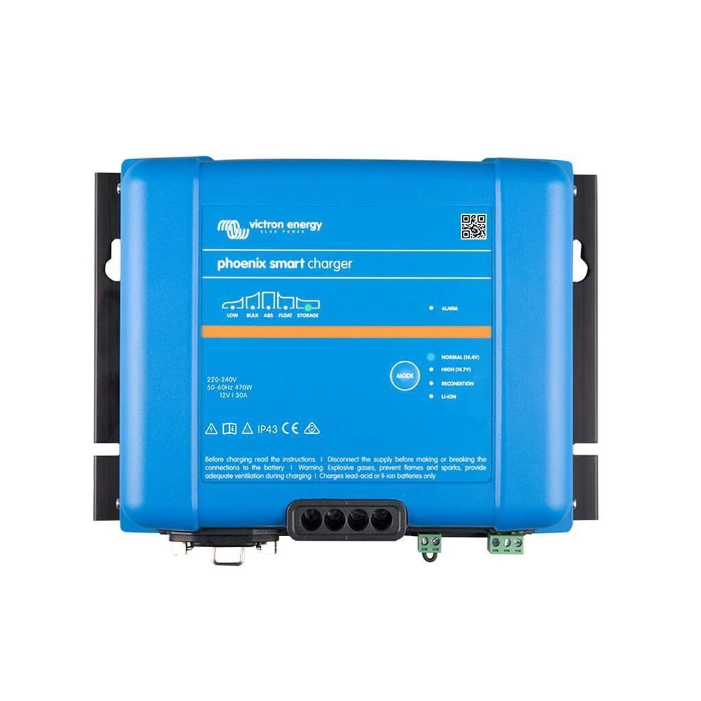 El Cargador Phoenix Smart IP43 24/16 (3) es compatible con baterías LiFePO₄. Permite un sencillo control de encendido/apagado mediante un relé o un optoacoplador conectado al puerto de encendido remoto del BMS Li-Ion. También es posible gestionar completamente la tensión y la corriente mediante Bluetooth.