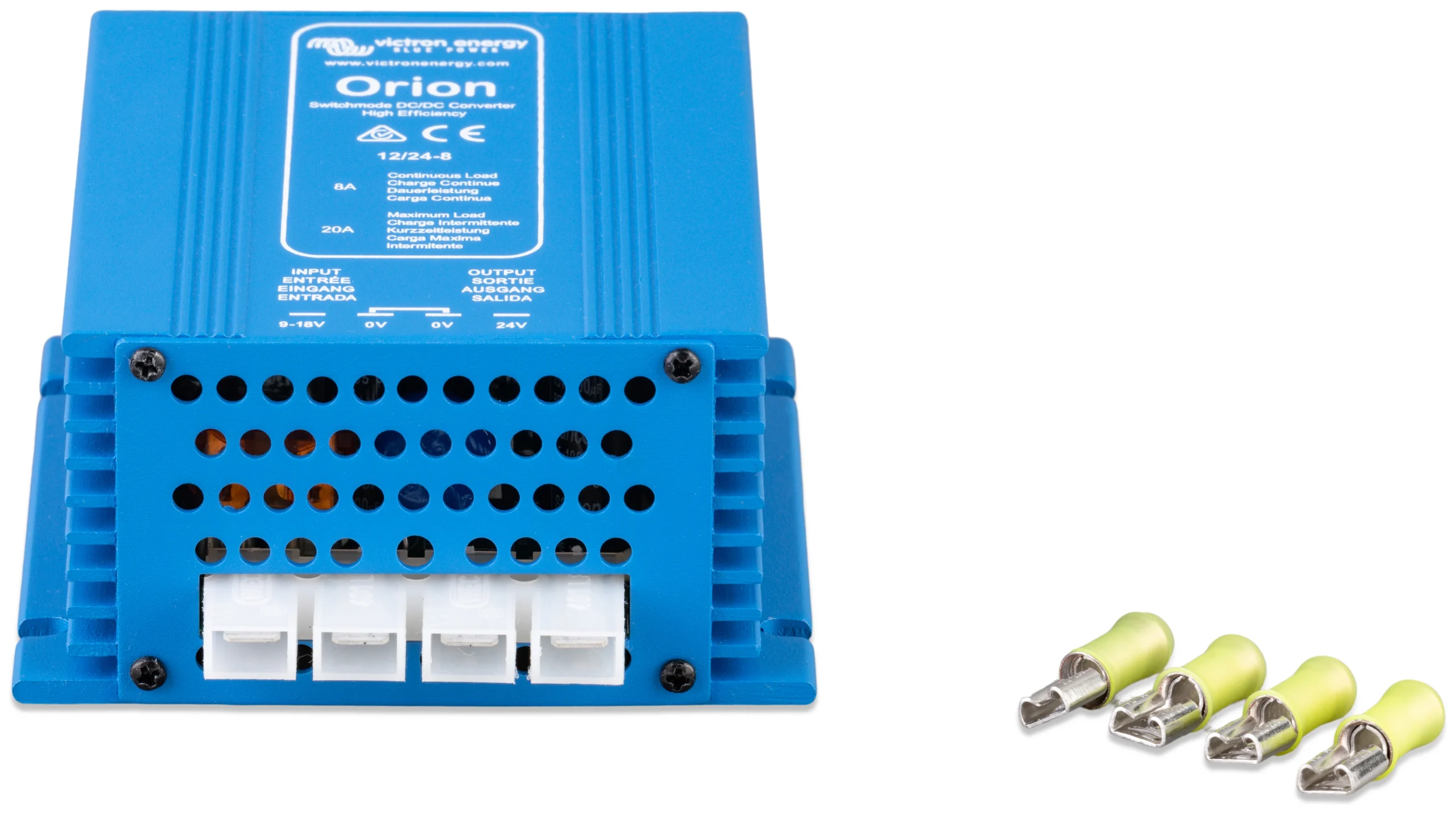 El Victron Convertidor Victron Orion 12/24-8 DC-DC IP20 es un convertidor DC-DC IP20 para elevar tensión de 12V a 24V en instalaciones interiores. Ideal para equipos que requieren 24V desde una fuente 12V.