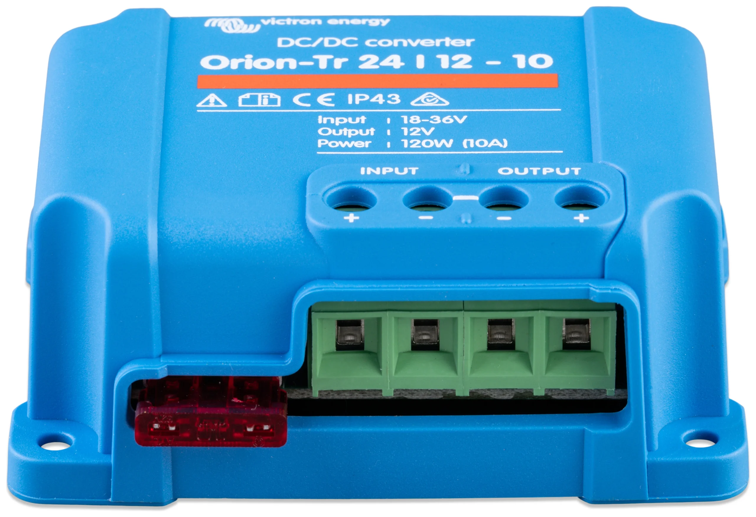 El Victron Convertidor Victron Orion Tr 24/12-10 (120W) DC-DC no aislado convierte de 24V a 12V con salida regulada, ideal para alimentar equipos 12V en sistemas 24V sin necesidad de aislamiento galvánico.