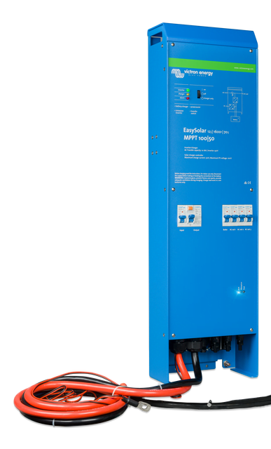 El EasySolar combina un SmartSolar MPPT 100/50, un inversor/cargador MultiPlus Compact 12/1600/70 y un distribuidor CA con protección integrada. Gracias a esta arquitectura, las baterías pueden cargarse tanto con energía solar como con alimentación CA procedente de la red o de un generador. Esto permite disponer de una solución energética versátil y bien optimizada para múltiples entornos de uso.