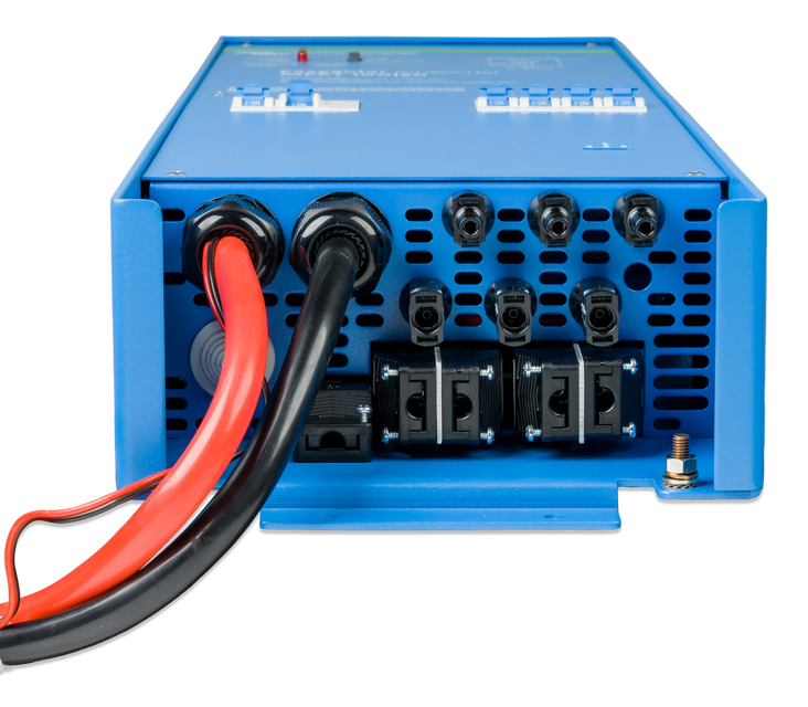 El distribuidor de corriente alterna incorpora un RCD de 30 mA y 16 A, así como cuatro salidas protegidas por disyuntores. Una de las salidas de 16 A está controlada por la entrada CA y solo se activa cuando hay alimentación disponible. Además, la tecnología PowerAssist de Victron ayuda a evitar la sobrecarga de la red o del generador añadiendo potencia adicional del inversor cuando hace falta, mejorando la estabilidad del sistema.