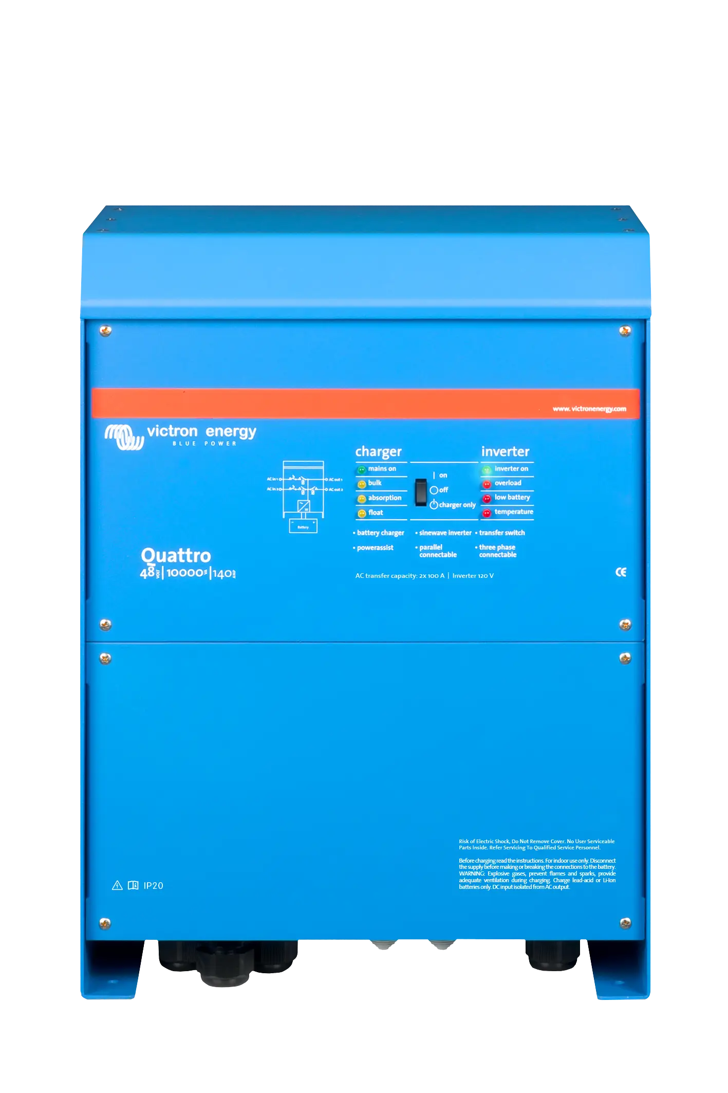 El Victron Quattro 48/10000/140-100/100 120V es un inversor/cargador de 48V con 10000 VA, cargador de hasta 140 A, dos entradas CA, dos salidas CA y comunicación VE.Bus. Es una solución de alto nivel para instalaciones de 48V que requieren gran potencia, respaldo continuo y control energético avanzado.