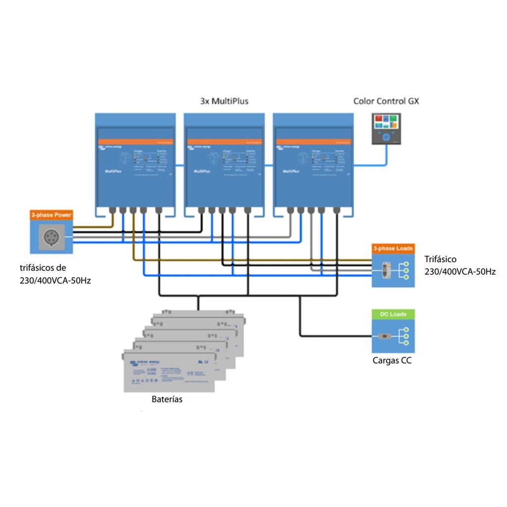 Además de la conexión en paralelo, se pueden configurar tres unidades Inversor MultiPlus 12/800/35-16 para una salida trifásica. Con tres bancadas de seis unidades en paralelo, se puede obtener un inversor trifásico de 45 kW/54 kVA y un cargador de 1260A.