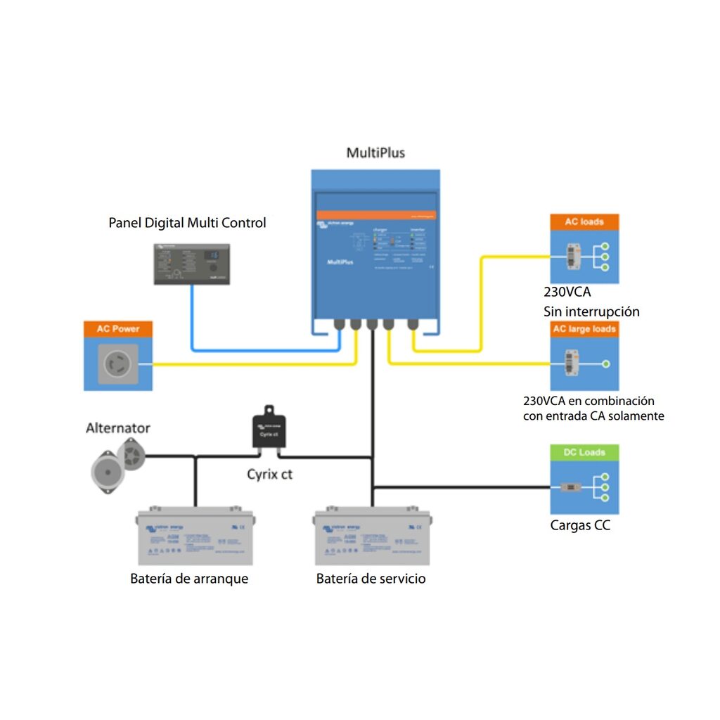 El Inversor MultiPlus 12/800/35-16 es un cargador de baterías muy potente y puede usar mucha corriente del generador o de la red del pantalán. En el Panel Multi Control puede establecerse una corriente máxima proveniente del generador o pantalán, evitando sobrecargar el sistema al ajustar automáticamente la corriente usada para la carga.
