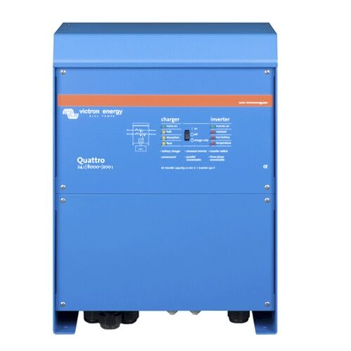 Con una potencia continua de 8000 VA y 6400 W a 25 ºC, además de un pico de potencia de 16000 W, este modelo está preparado para alimentar cargas exigentes en sistemas de 24V. Su cargador integrado proporciona hasta 200 A, con tensiones de absorción, flotación y almacenamiento adaptadas a baterías de 24V. Gracias a su robustez, capacidad de integración y prestaciones avanzadas, el Victron Quattro 24/8000/200-100/100 es una opción de referencia para instalaciones donde se necesita fiabilidad, potencia y control inteligente.