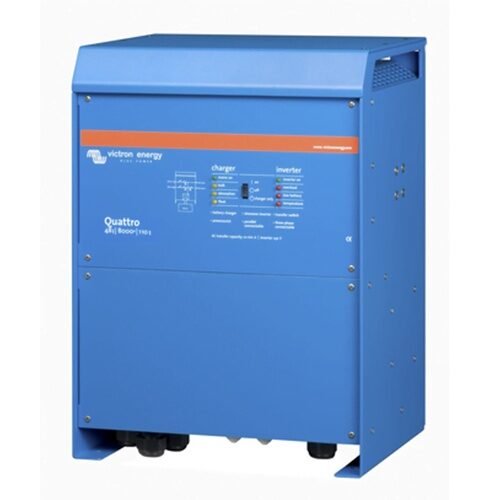 Este modelo ofrece una potencia continua de 8000 VA y 6400 W a 25 ºC, además de un pico de potencia de 16000 W, lo que lo hace ideal para sistemas de 48V con cargas importantes. Su cargador integrado proporciona hasta 110 A y trabaja con tensiones de absorción, flotación y almacenamiento adaptadas a bancos de baterías de 48V. Gracias a su robustez, capacidad de expansión y compatibilidad con baterías de litio-ion, el Victron Quattro 48/8000/110-100/100 es una solución potente y versátil para sistemas de alta exigencia.