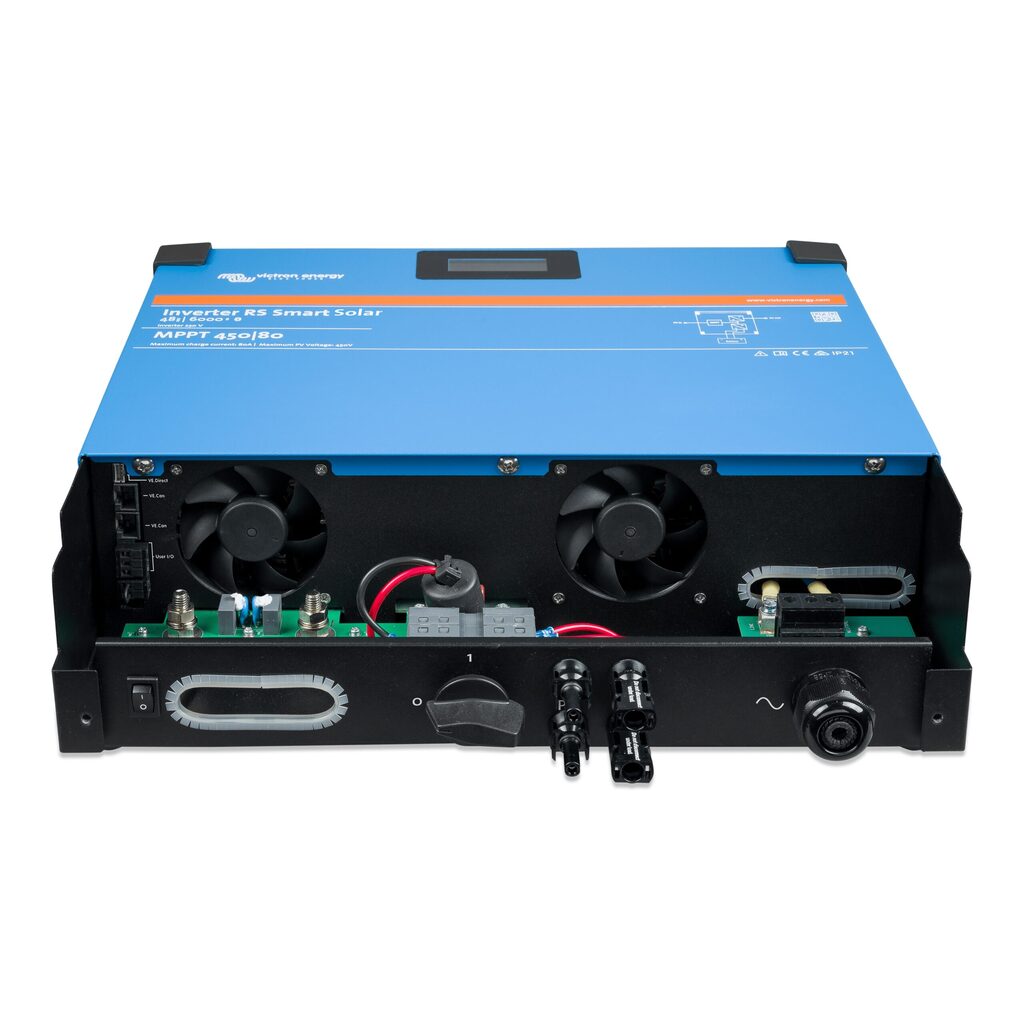 El inversor RS Smart es un potente inversor de 48 VCC, 6 kVA y 230 VCA Cuenta con un diseño moderno y una tecnología de alta frecuencia, solo pesa 11 kg y tiene una eficiencia excelente, un bajo consumo en reposo y un funcionamiento muy silencioso.