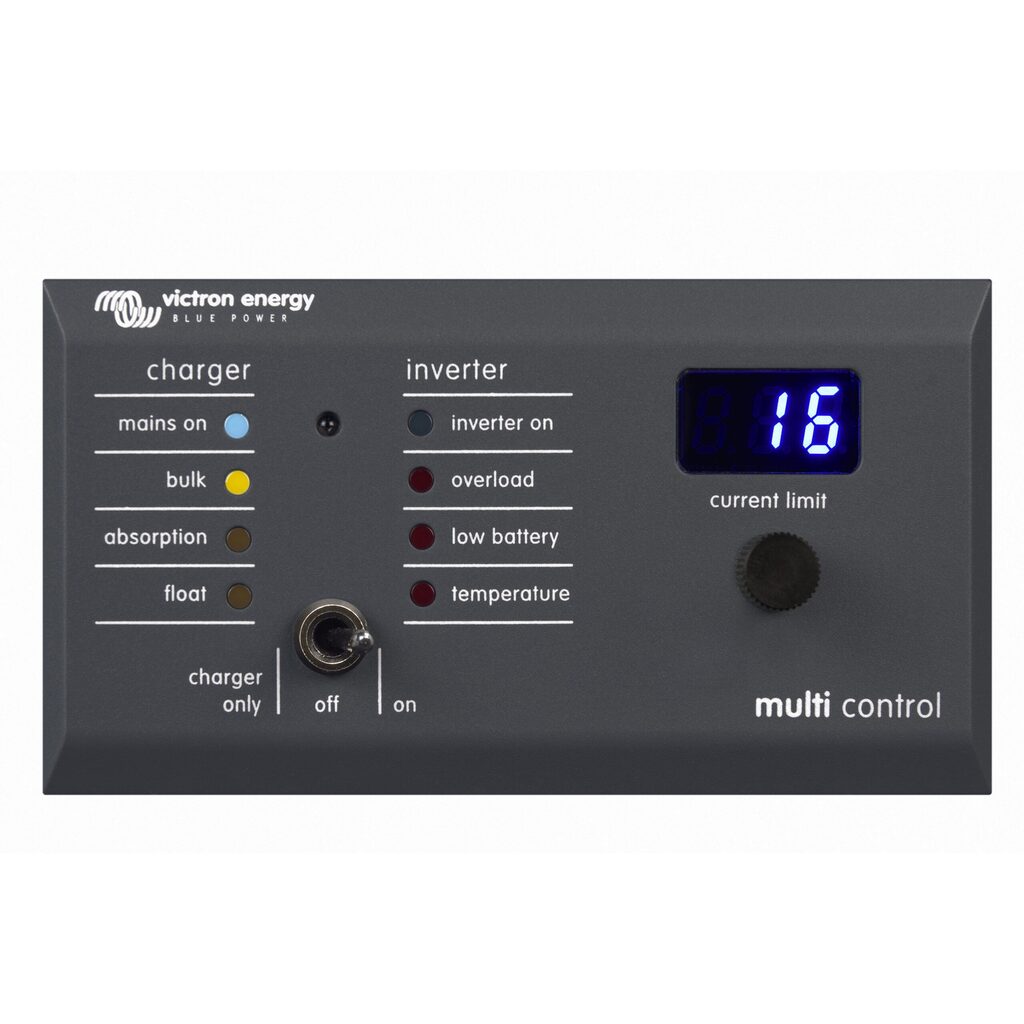 El Digital Multi Control se utiliza para consultar y ajustar de forma remota las corrientes CA de entrada y para encender o apagar los Multis o Quattros. Ha sido diseñado para integrarse limpiamente en el panel de control de su sistema instalado en su barco, en su vehículo o en su hogar.