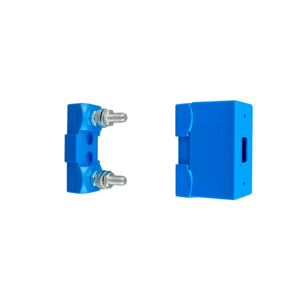Este portafusibles está pensado para trabajar con fusibles MEGA y puede combinarse con barras de conexión específicas para crear bloques de distribución protegidos. Es una opción muy útil en sistemas de baterías, inversores/cargadores, instalaciones solares, náutica y aplicaciones técnicas de corriente continua.