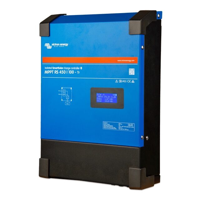 El MPPT RS SmartSolar es un controlador solar de 48 V diseñado para maximizar la carga de baterías en sistemas fotovoltaicos tanto aislados como conectados a la red, con una capacidad de entrada FV de hasta 450 VCC y una salida de 100 A o 200 A.